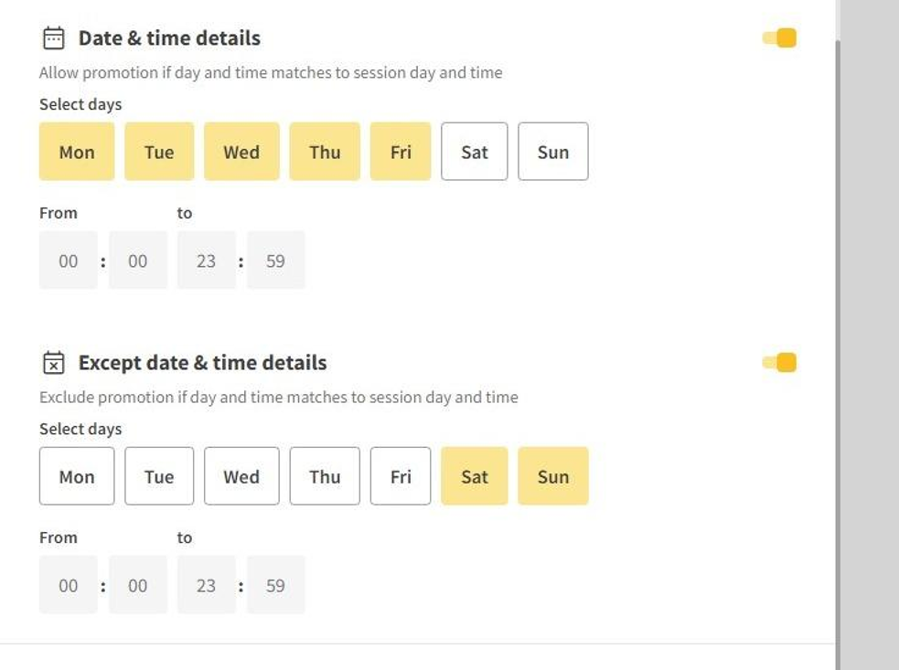 11.- Date & time details: allows promotions if day and time matches to session day and time