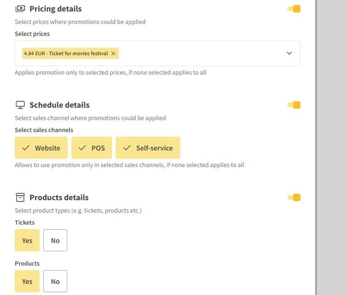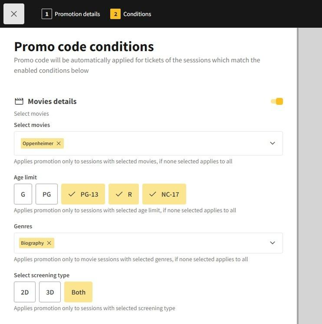 - Movies details: applies promotions only to sessions with selected movies, if none selected applies to all