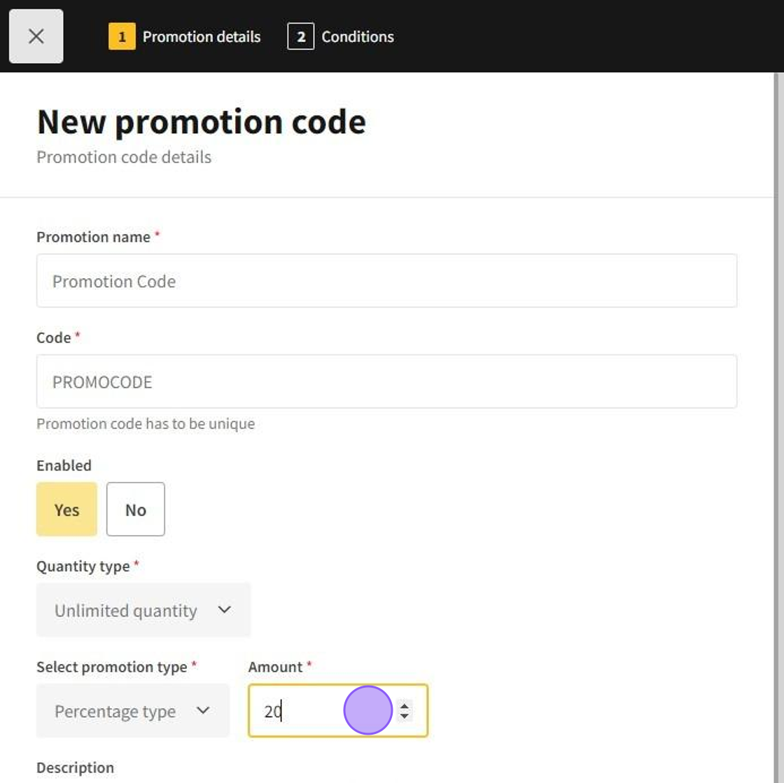 - Select if the promo code quantity is unlimited or limited to a fixed amount in Quantity type