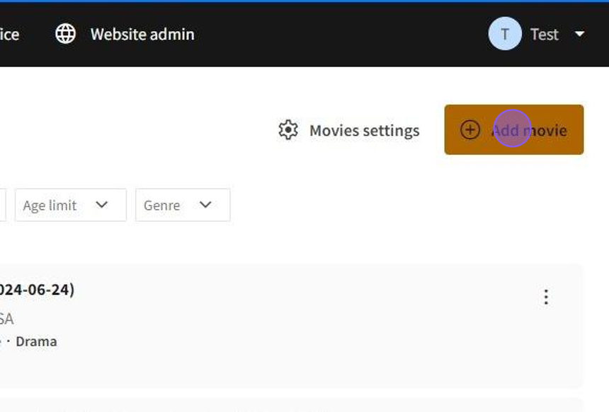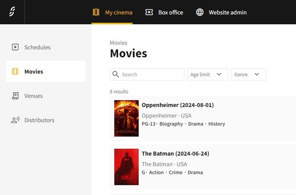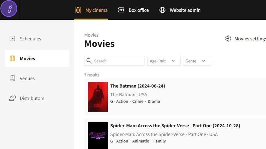 1.To navigate to the Movies page, click on "My cinema" and then select "Movie".
