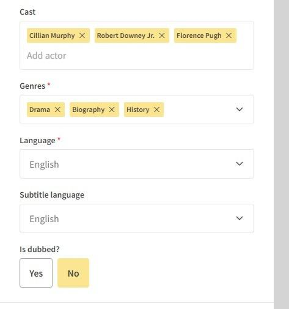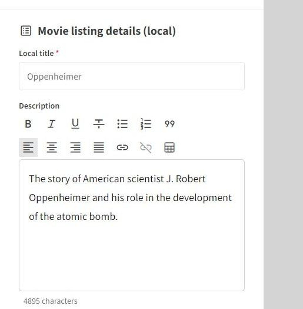 4.Inside the movie/edit page, you can add details about the movie on the left side and media related to the movie on the right side.