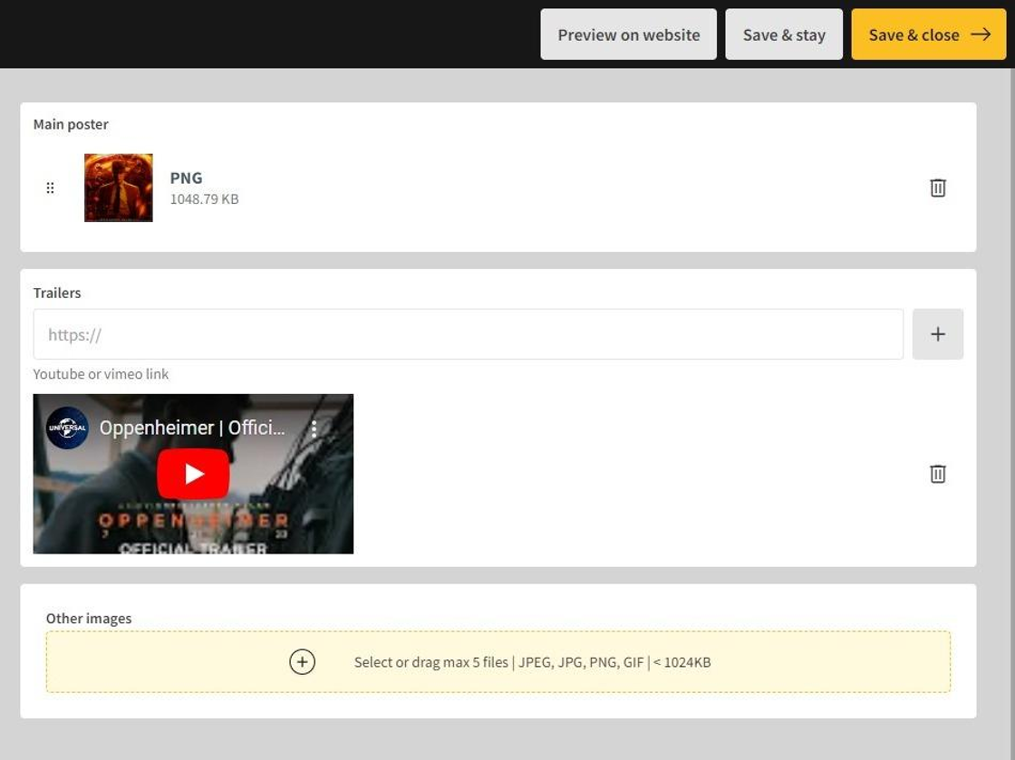 - In Other images some additional images for the movie can be added (Max 5 files | JPEG, JPG, PNG, GIF file formats | less than 1024KB in file size)