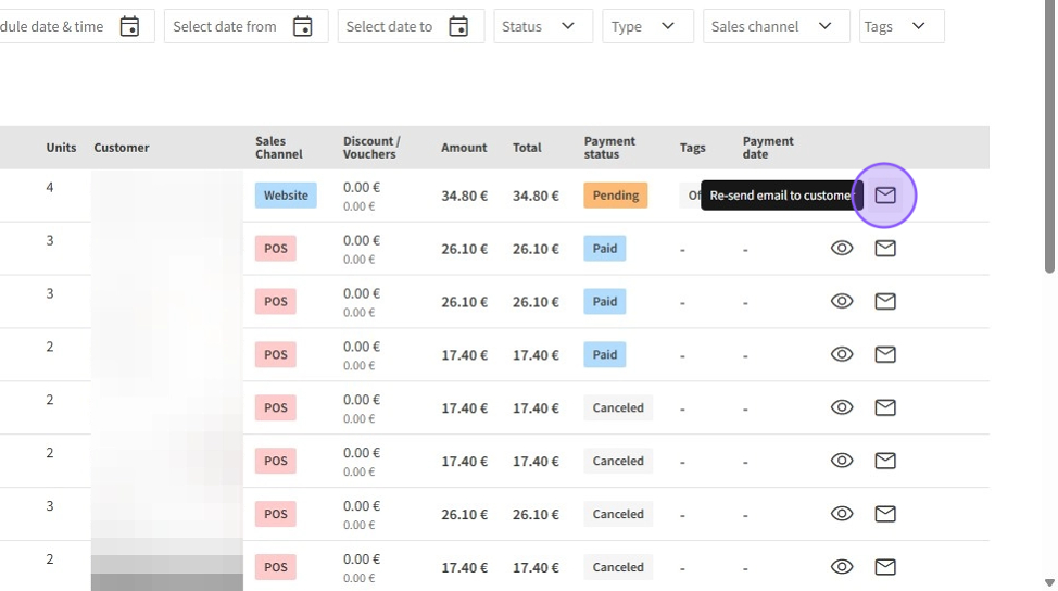3.To resend order confirmation emails to customers, click the envelope icon located on the right side.