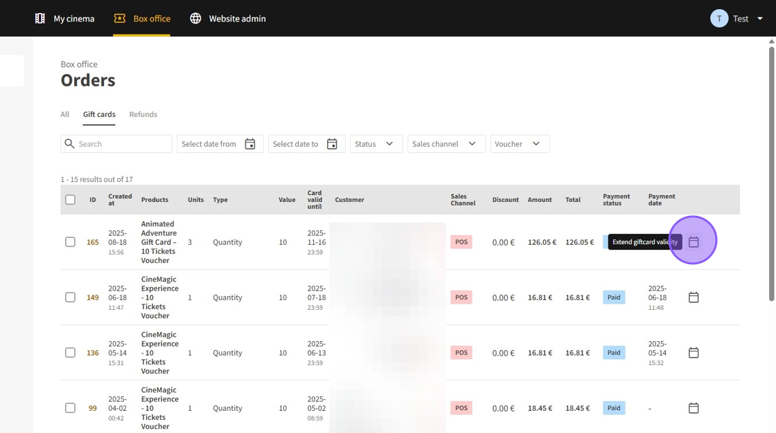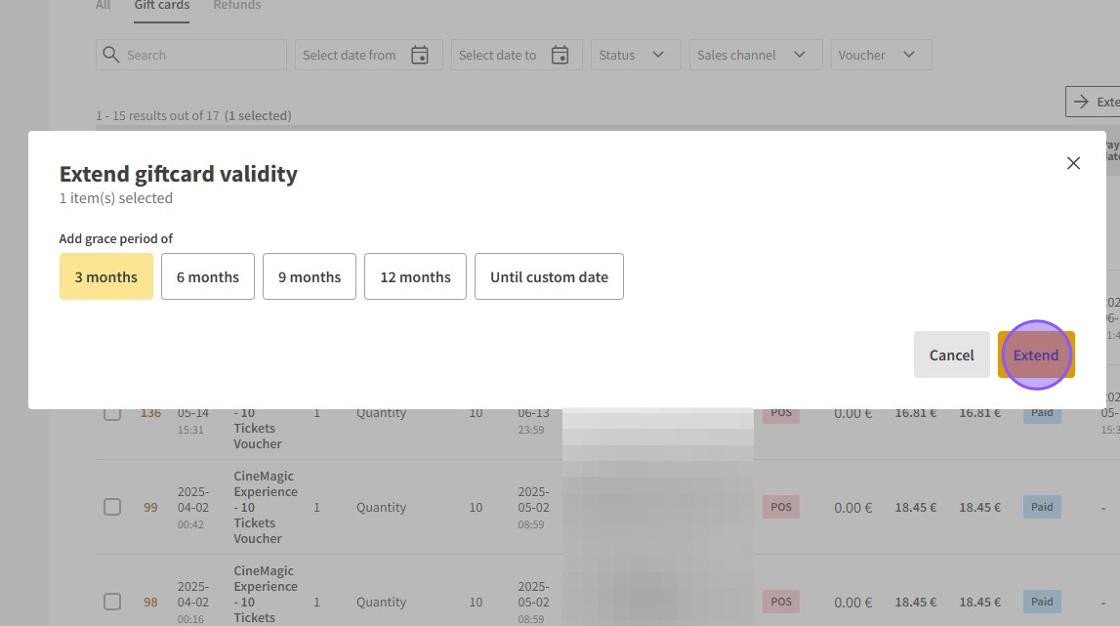 15.In the Gift Card tab, extend the validity period by clicking the calendar icon next to the respective gift card.
