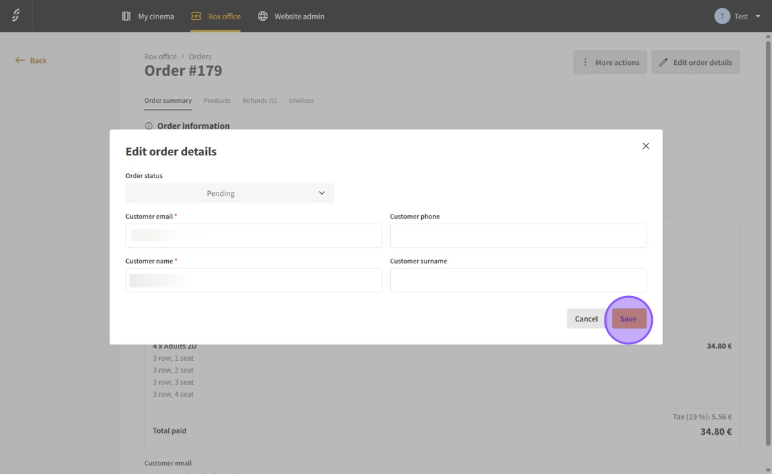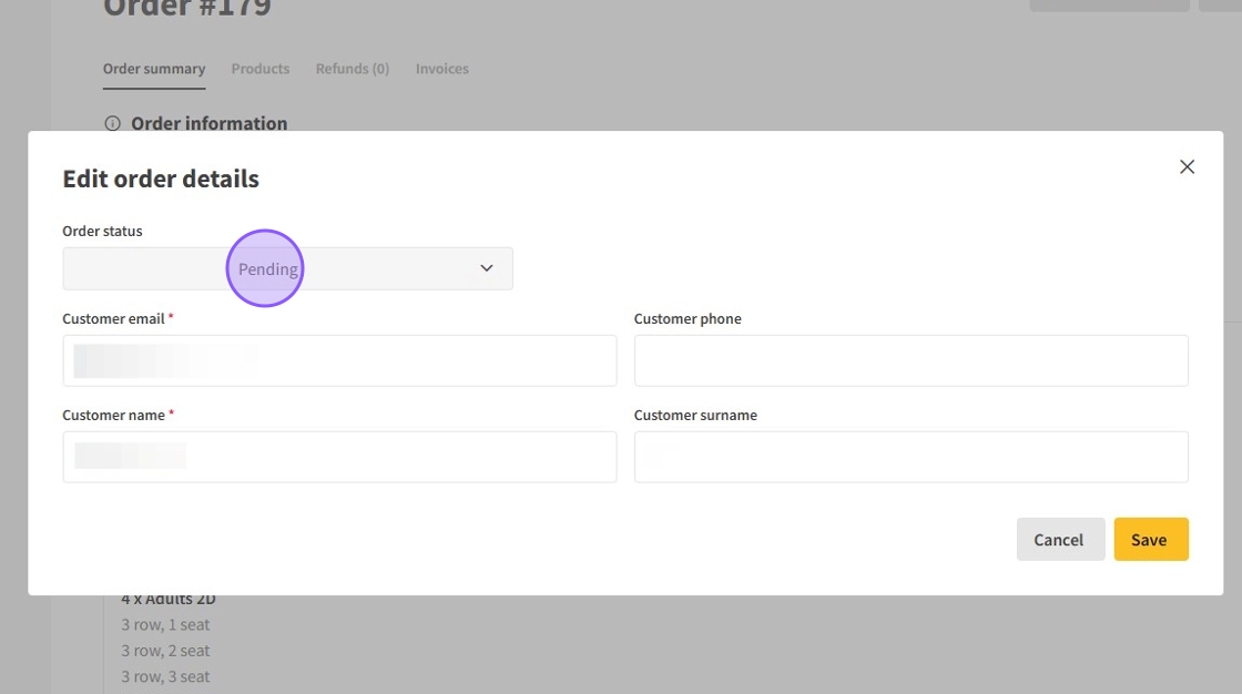 9.Here, you can update customer details such as email, phone number, first name, last name, or adjust the order status using the dropdown menu.