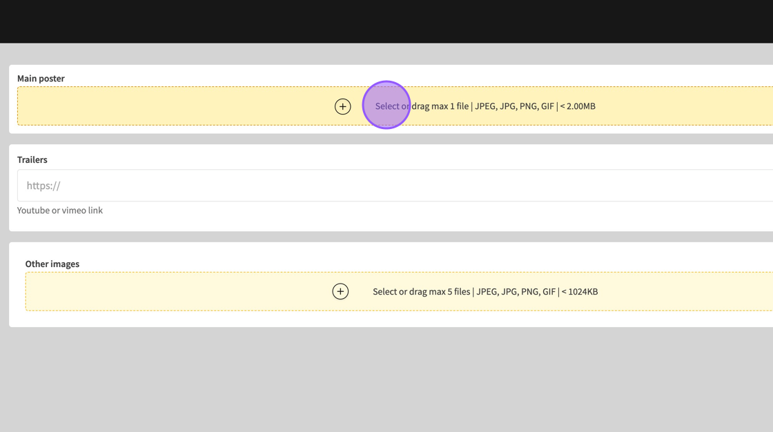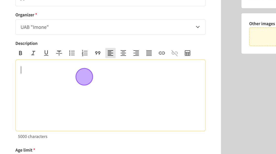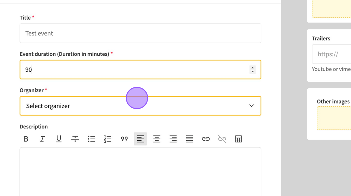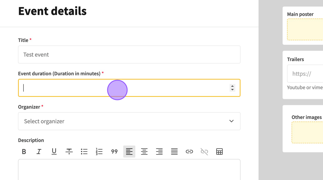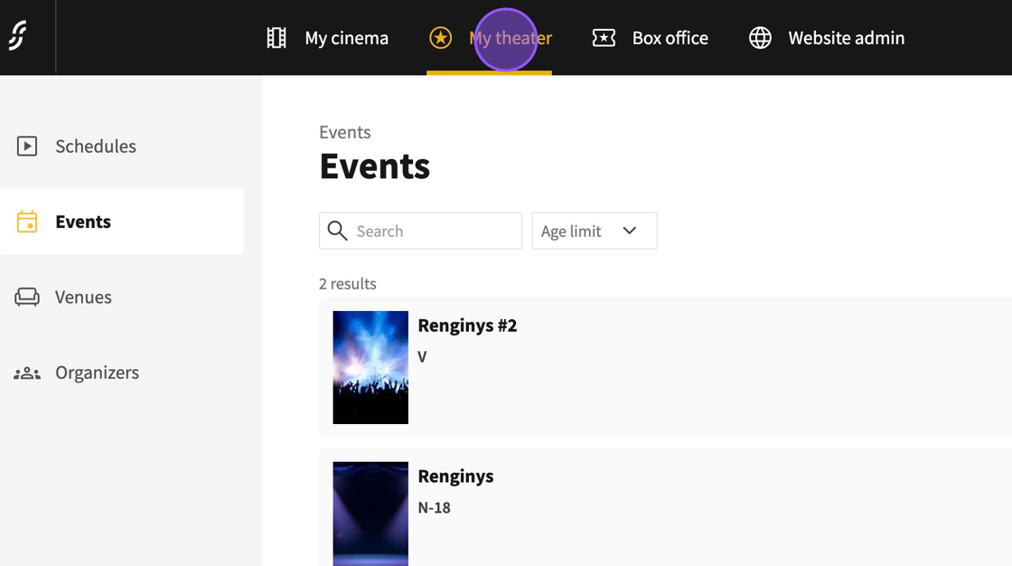 How To Add A New Event 1.Click "My theater" 2.Click "Add event" 3.Enter event title 4.Click "Add events" 5.Enter event duration 6.Select event organizer 7.Type event description 8.Select age limit 9.Upload main event poster 10.Click "Save & close"
