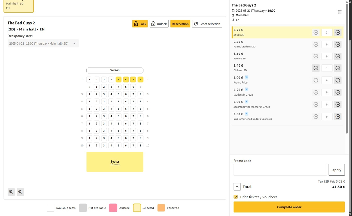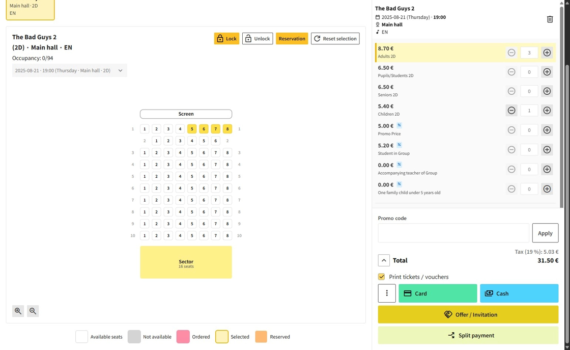 Split payment: Enter the amount paid in cash; the system will calculate the remaining balance to be paid by card.